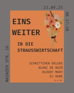 Wir laden ein zu einem etwas anderen Weinfest – und das mitten in der Südstadt. Diesmal gibt es Schnittchen statt Häppchen und wer unsere leckeren Weine nicht probieren möchte, für den mixen wir einen ebenso schmackhaften Cocktail. Etwas Unalkoholisches wird es natürlich wie immer auch zur Getränkeauswahl geben. Genauso wie die passende musikalische Untermalung dieses Mal von DJ Rebe.