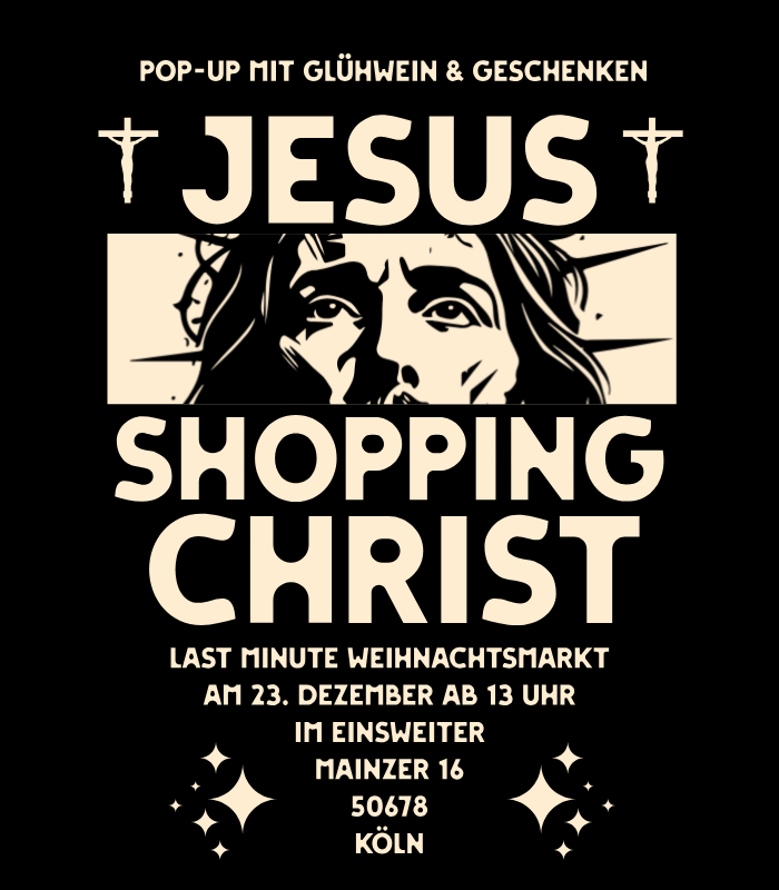 Das letzte Türchen öffnet nur einen Tag vor Heiligabend. Von 13:00 bis 18:00 Uhr gibt’s bei uns Kunst, Kunsthandwerk, Kulinarisches und das schönste Geschenkpapier der Südstadt. Aber auch, wenn Ihr keine besinnlichen Besorgungen mehr tätigen müsst, lohnt sich ein Besuch bei uns – für heiße Waffeln, leckere Plätzchen oder sündhaft guten Glühwein. Und eine taktvollere Musikauswahl als auf dem rotnasigen Rudolfplatz in der eisigen Kälte.